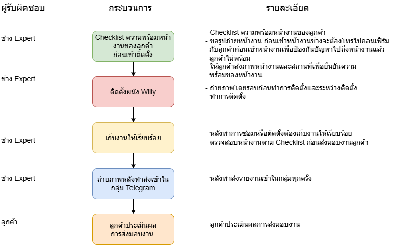 เพื่อกำหนดขั้นตอน มาตรฐาน วิธีการติดตั้งผนัง Willy ให้ได้คุณภาพ ปลอดภัย ตรงแบบ และลดปัญหาการร้องเรียน เช่น การเจาะผิดตำแหน่ง งานไม่เรียบร้อย รอยต่อไม่สนิท ฯลฯ