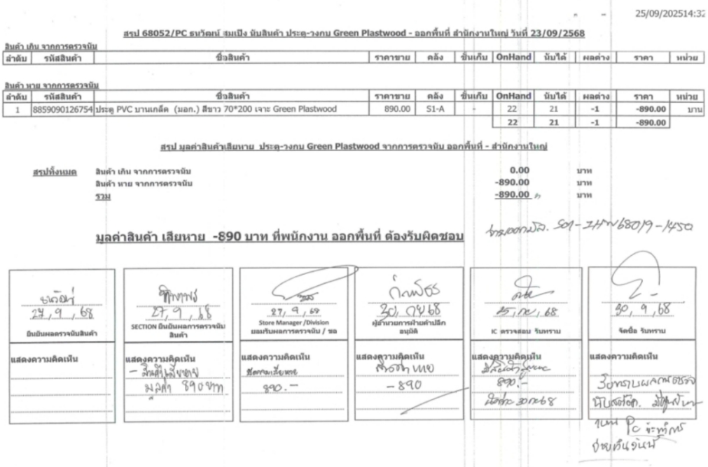 เนื่องจากได้รับแจ้งพบปัญหา พนักงานนายธนวัฒน์ สมเป็ง ตำแหน่ง พนักงาน PC Green Plastwood ลาออกและตรวจนับสต๊อกสินค้าพบว่าสินค้าประตูสูญหาย 1 บาน ราคา 890 บาท แต่พนักงานออกบิลในนามชื่อลูกค้าคุณปรีชา ปินตา เพื่อป้องกันปัญหาไม่ให้เกิดขึ้นในอนาคตจึงขอให้ส่วนที่เกี่ยวข้องจัดทำมาตรการป้องกันเพื่อไม่ให้เกิดปัญหาซ้ำ
