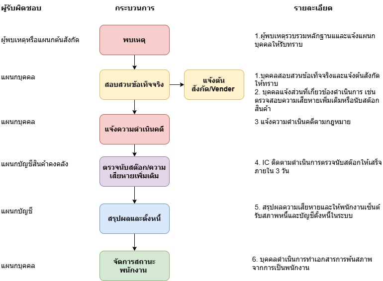 4.1.1 เมื่อพบเหตุจากกล้องวงจรปิด การตรวจนับสต๊อก หรือจากพยานบุคคล ให้หัวหน้าแผนกหรือผู้จัดการสาขารายงานทันที