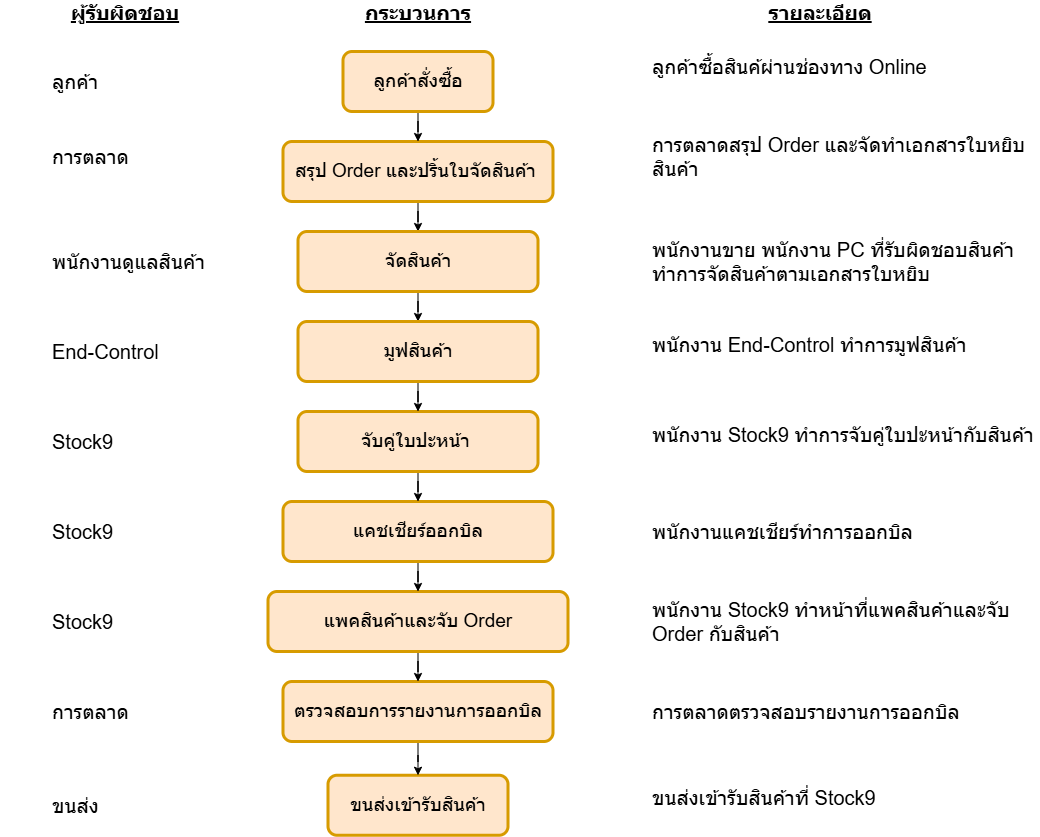 - เมื่อของถึงสำนักงานใหญ่แล้ว การตลาดจะดำเนินการรับสินค้าและส่งให้ทาง Stock9 ทำการแพคสินค้า
