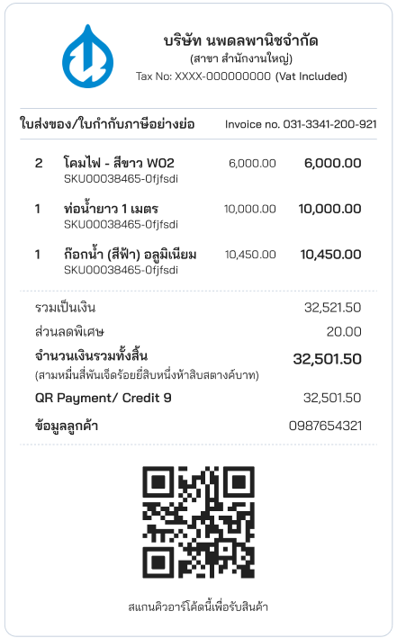 ระบบพิมพ์ใบส่งของ / ใบกำกับภาษีอย่างย่อ และส่วนท้าย จะมี QR Code เพื่อสแกนรับสินค้า