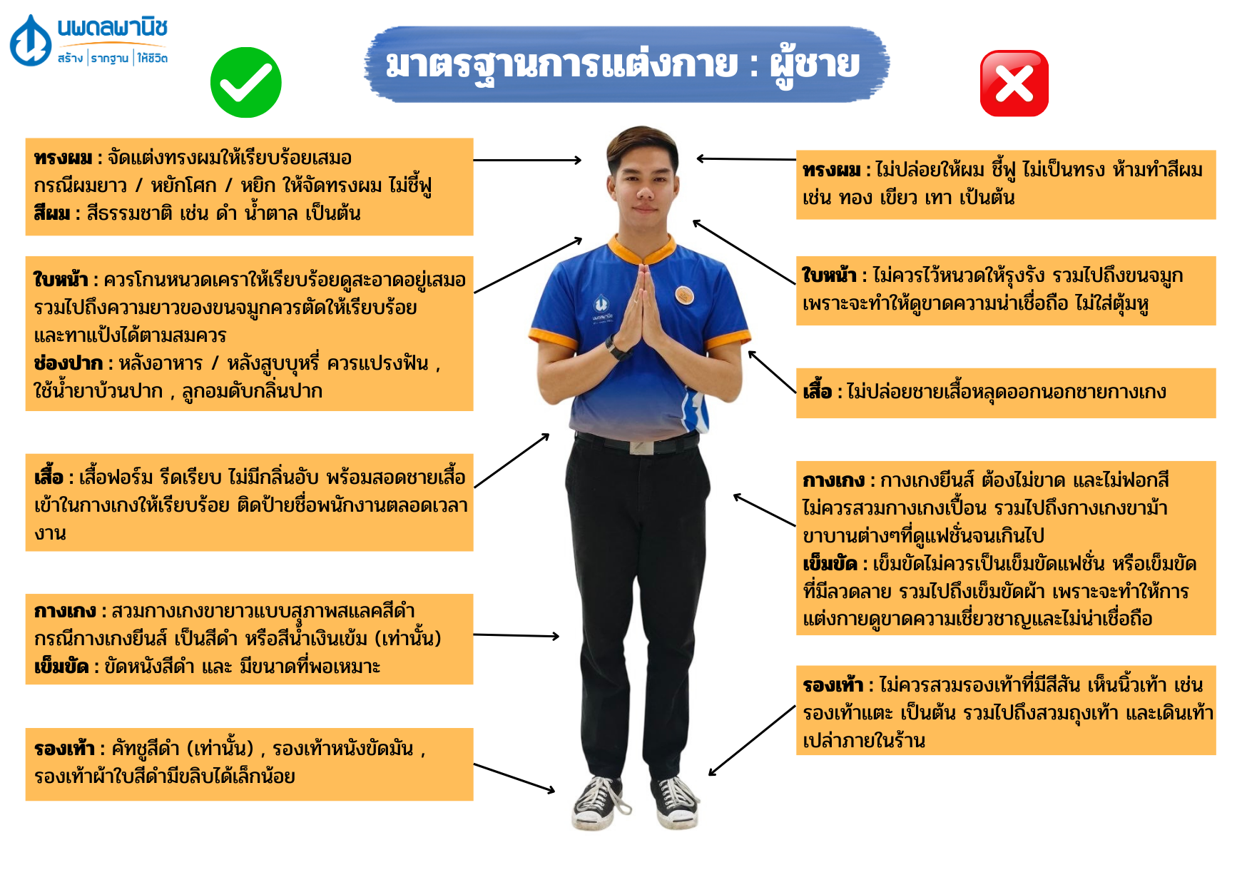 แต่งกายด้วยยูนิฟอร์มร้าน ติดป้ายชื่อ รองเท้าเป็นแบบหุ้มส้นสีสุภาพ (หรือรองเท้านิรภัยในโกดัง)