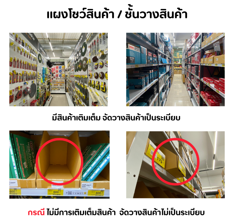 ไม่ผ่าน : วางตามจุดที่กำหนดแต่ไม่เป็นระเบียบ / ไม่วางตามจุดที่กำหนด / ไม่มีการเติมเต็มสินค้า / ไม่ติดป้ายราคา , ป้ายราคาชำรุดหลุดร่วง / ไม่มีสินค้าในแผง