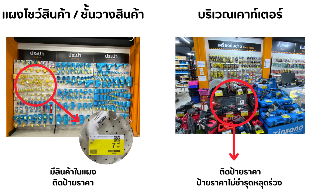 7. ป้ายราคาที่สินค้าโชว์ต้องมีป้ายราคาครบทุกรายการ ต้องเป็นรูปแบบตามมาตรฐาน (สรุปมาตรฐานป้ายราคาอีกครั้ง , ป้ายติดที่สินค้า มีชื่อ + ราคาอยู่ในป้ายเดียว)