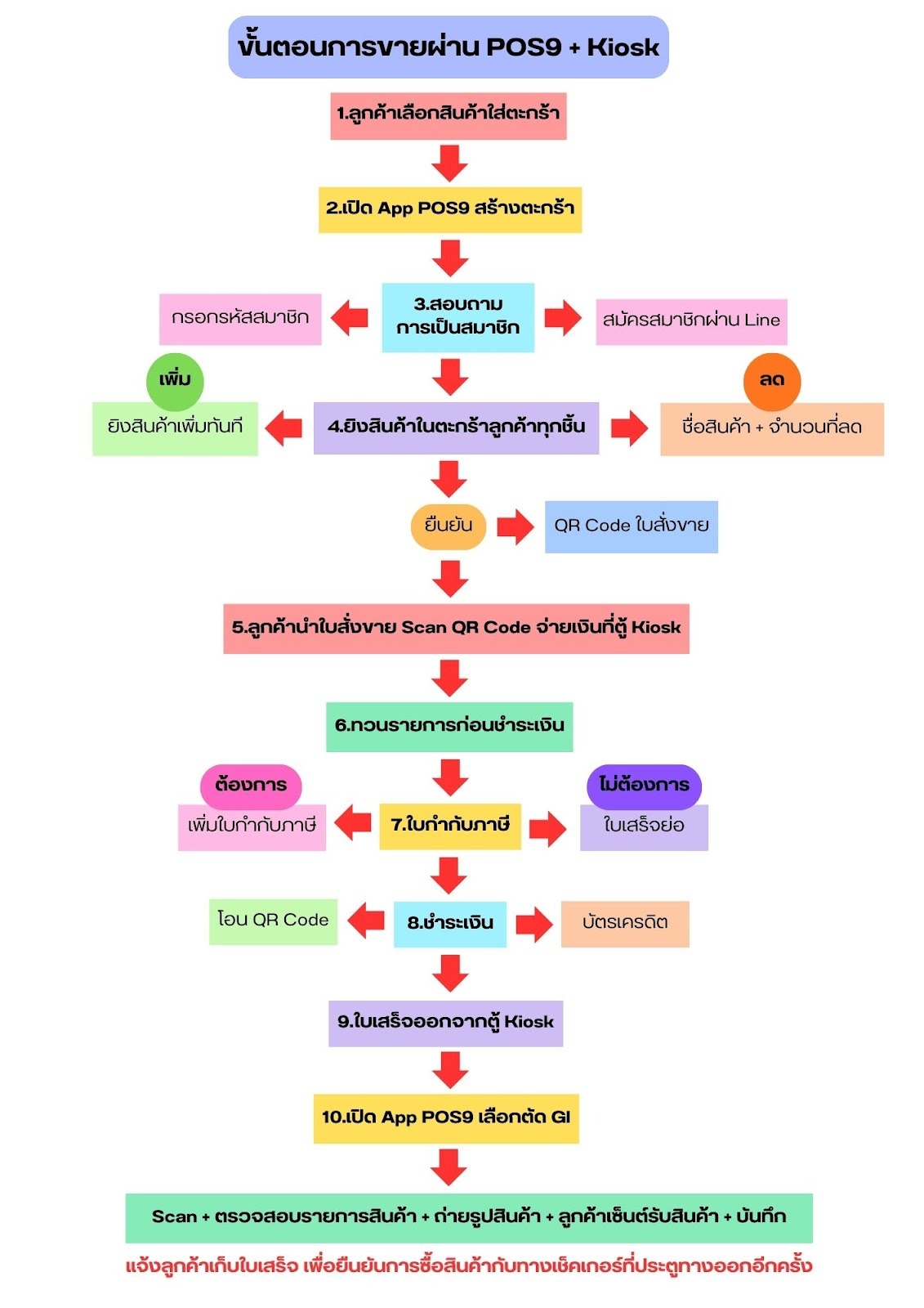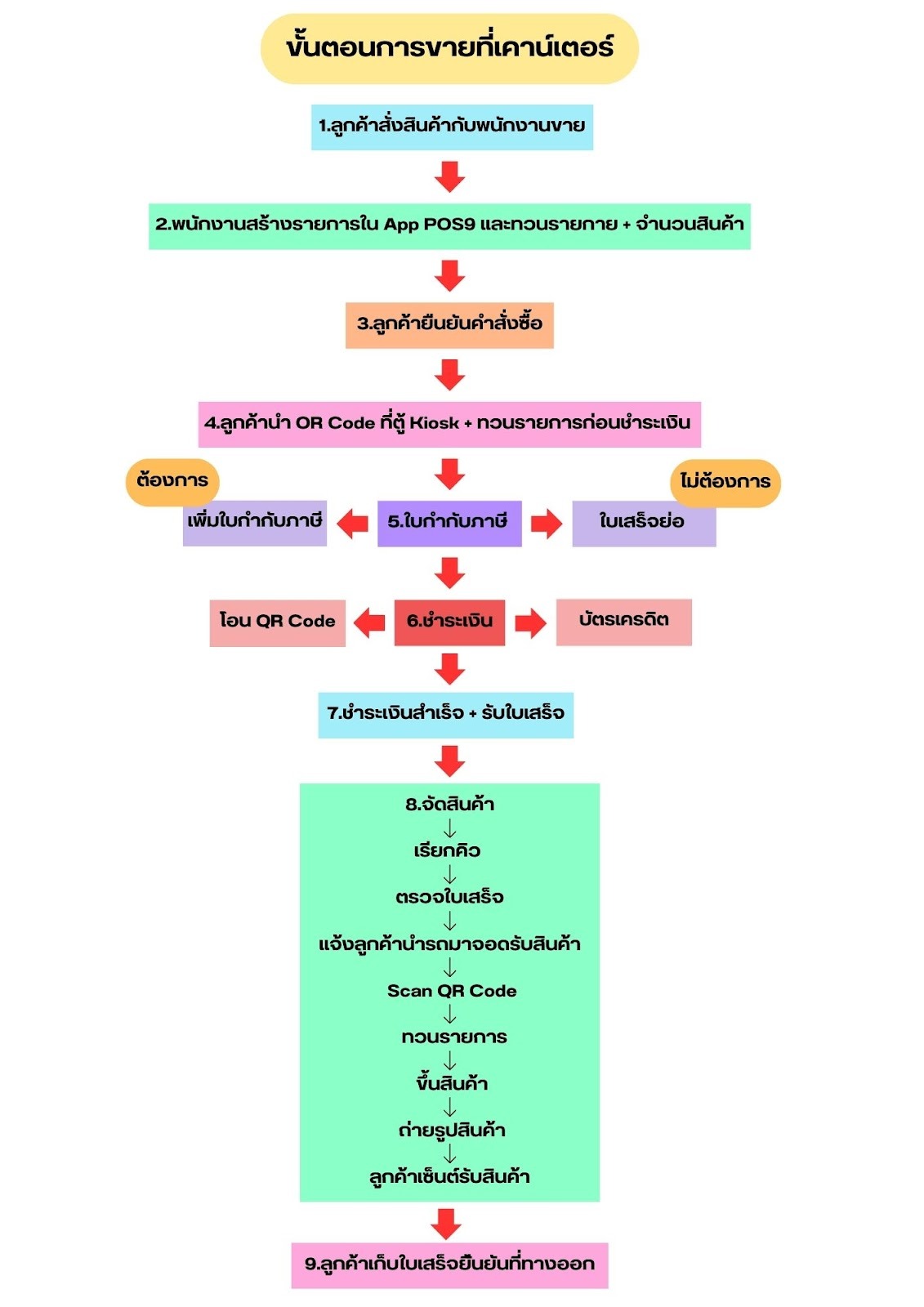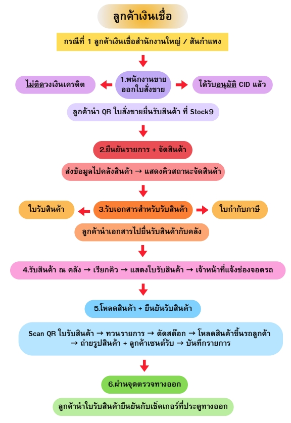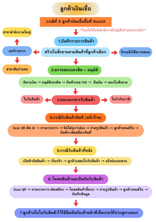 1.พนักงานขาย Stock9 สร้างใบสั่งขายตามสินค้าที่ลูกค้าเลือกแชร์รายการไปยังพนักงานขายสำนักงานใหญ่/สันกำแพงโทรแจ้งให้ตรวจสอบรายการ จำนวน และราคา 2. ตรวจสอบวงเงินเครดิตหากติดวงเงิน → ขออนุมัติเครดิตบันทึกเลข CID ให้เรียบร้อยยืนยันใบสั่งขาย → ระบบออก QR ใบสั่งขาย 3.พนักงานขายสแกน QR เพื่อออกใบรับสินค้า/ใบกำกับภาษี ให้ลูกค้า 4.กรณีรับสินค้าทันที (หน้าร้าน)พนักงานขายสแกน QR ใต้ใบรับสินค้า (ตัด GI)ทวนรายการสินค้าจัดใส่ถุง/กล่องถ่ายรูปสินค้า ลูกค้าลงลายมือชื่อรับสินค้า บันทึกและตัดสต๊อกทันที |