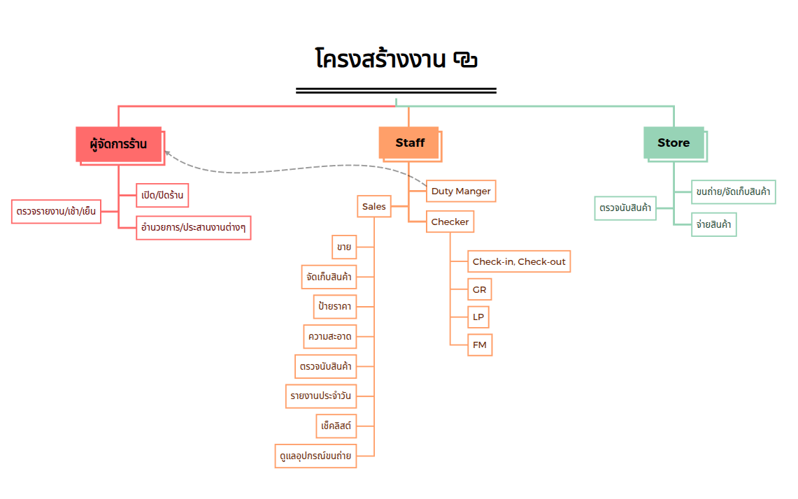 พนักงานประจำสาขารวม 15-20 คน ต่อ 1 สาขา ประกอบไปด้วย ผู้จัดการร้าน,Staff Stock และพนักงานคลังสินค้า และพนักงานตรวจรับสินค้า