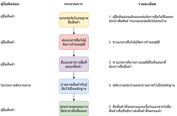 - พนักงานจ่ายสินค้าให้พร้อมถ่ายภาพผู้ยืมและสินค้าไว้เป็นหลักฐาน