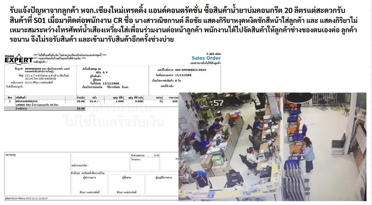 รับแจ้งปัญหาจากลูกค้า หจก.เชียงใหม่เทรดดิ้ง แอนด์คอนตรัคชั่น ซื้อสินค้าน้ำยาบ่มคอนกรีต 20 ลิตรแต่สะดวกรับสินค้าที่ S01 เมื่อมาติดต่อพนักงาน CR ลูกค้ารอนาน จึงไม่รอรับสินค้า และเข้ามารับสินค้าอีกครั้งช่วงบ่าย