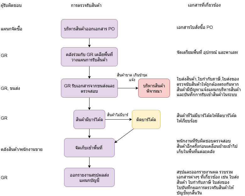 สินค้าไม่ตรงเอกสาร / ไม่ครบ / เสียหาย → แจ้งฝ่ายบริหารสินค้าและทำบันทึกหมายเหตุ