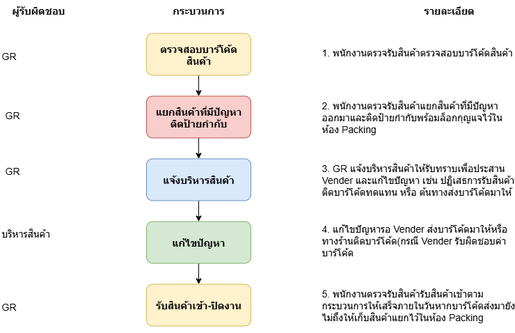- พนักงานตรวจรับสินค้าต้องรับสินค้าเข้าในระบบทุกสิ้นวันแม้ว่าจะมีปัญหาเรื่องบาร์โค้ดที่ต้องแก้ไข