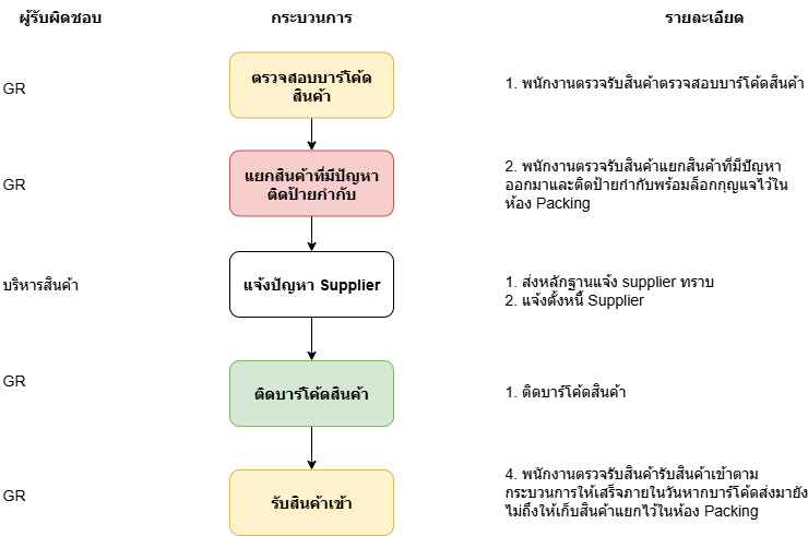 - พนักงานตรวจรับสินค้าต้องรับสินค้าเข้าในระบบทุกสิ้นวันแม้ว่าจะมีปัญหาเรื่องบาร์โค้ดที่ต้องแก้ไข